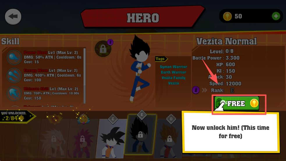 4、满足解锁条件后,点击“FREE”按钮,免费解锁角色,增加你的战斗阵容。