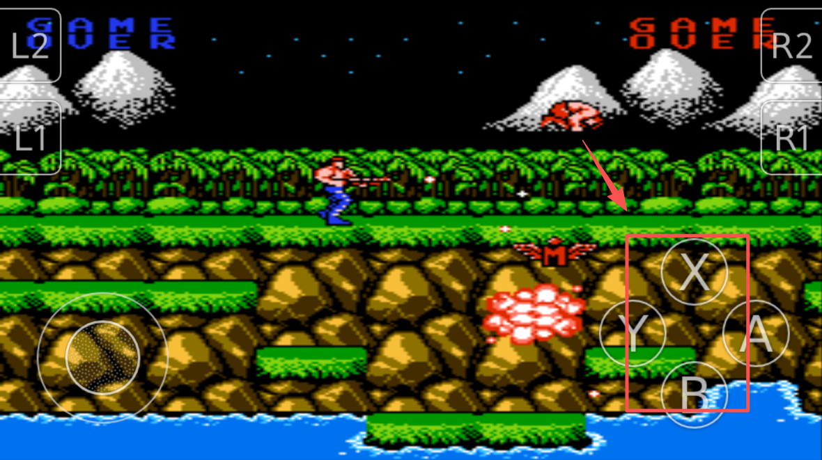 2、使用摇杆和A键控制角色移动射击。掌握基本操作,击败敌人。
