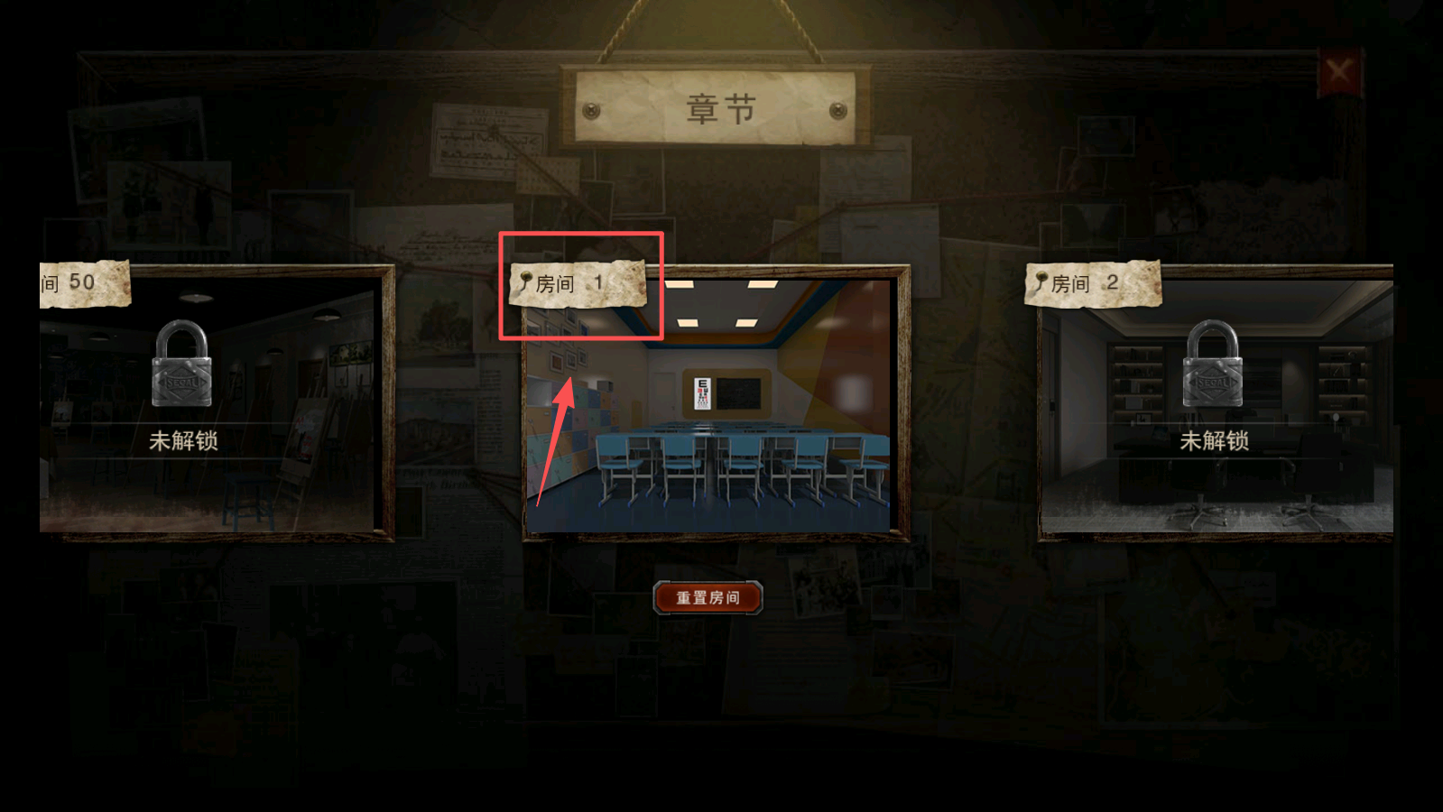 2、选择“房间1”开始你的逃脱之旅。点击“重置房间”可重新开始当前关卡。