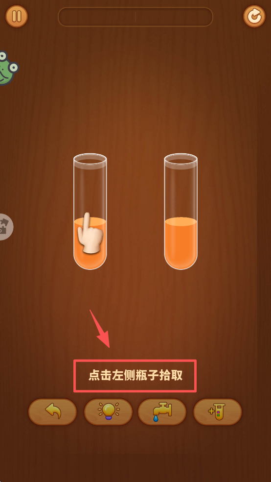 1、点击左侧瓶子拾取色。这是游戏的基本操作,让你开始匹配颜色的第一步。