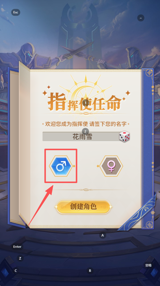 1、首先,点击“创建角色”按钮,输入你的角色名称,开始创建你的游戏角色。