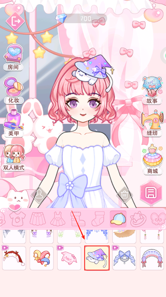 4、选择并点击不同的配饰图标,为角色添加帽子等,完成整体造型。
