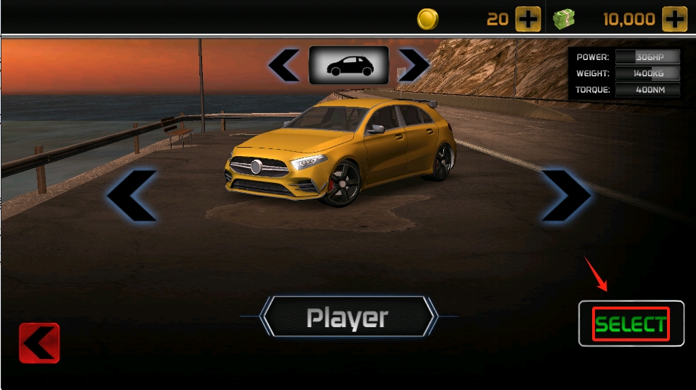 2、在车辆选择界面,点击 “SELECT” 按钮,选择赛车。