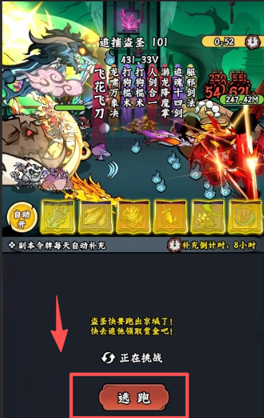 2、在关卡选择界面,点击“逃跑”按钮,进入战斗场景,开始挑战。