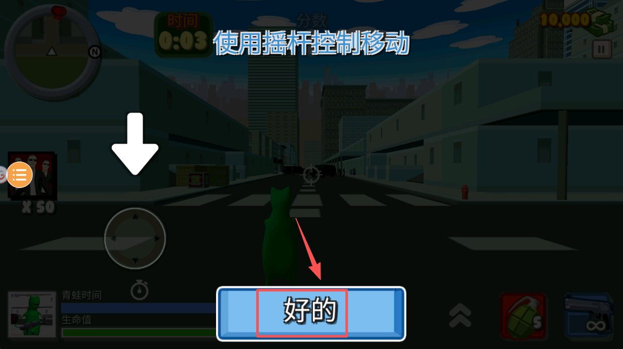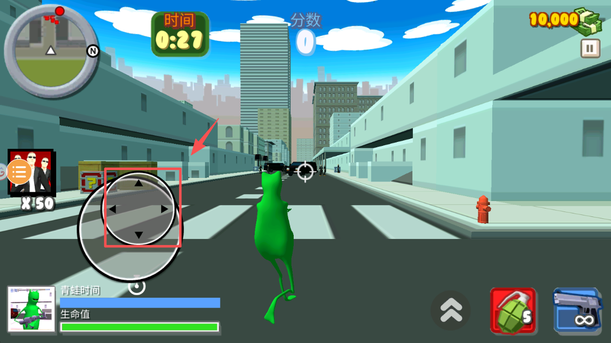 3、控制角色移动,使用左下角虚拟摇杆,控制青蛙角色移动。