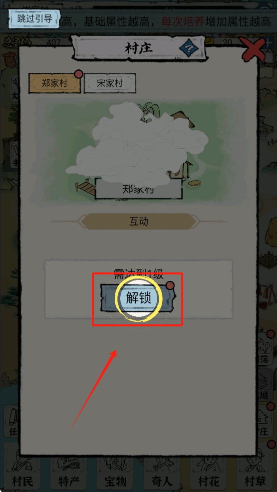 3、在村庄界面,点击 “解锁” 按钮,当达到相应等级后,即可解锁新的村庄内容。