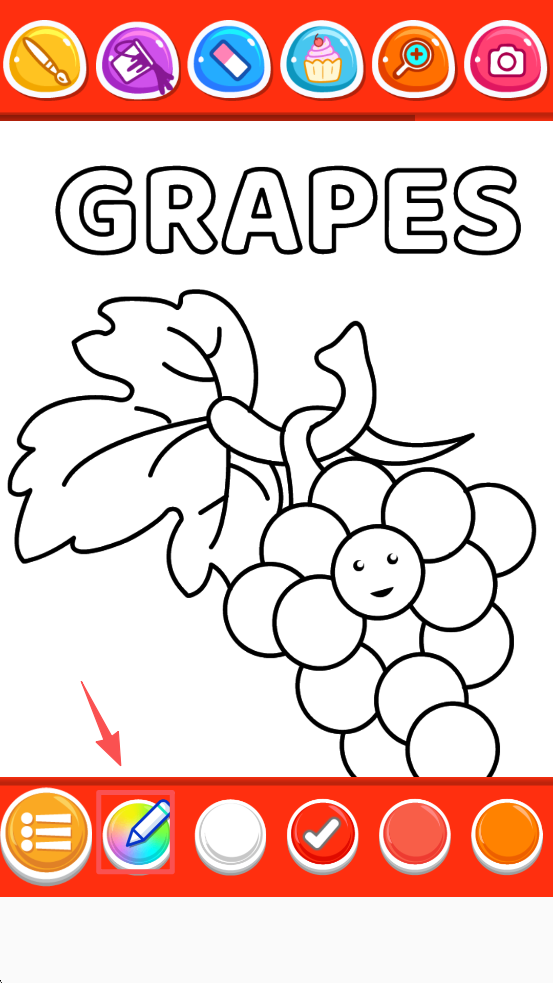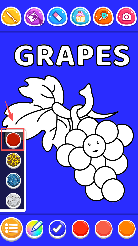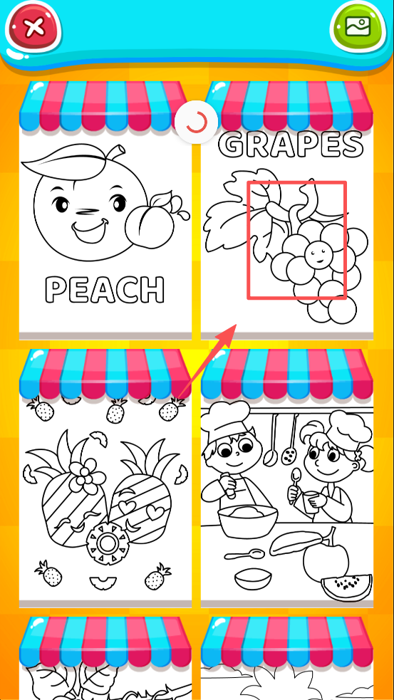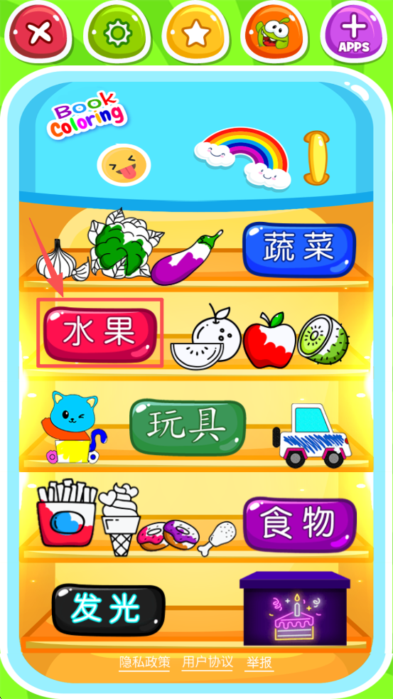 1、点击不同的分类按钮,如“水果”,选择你想要涂色的图案。