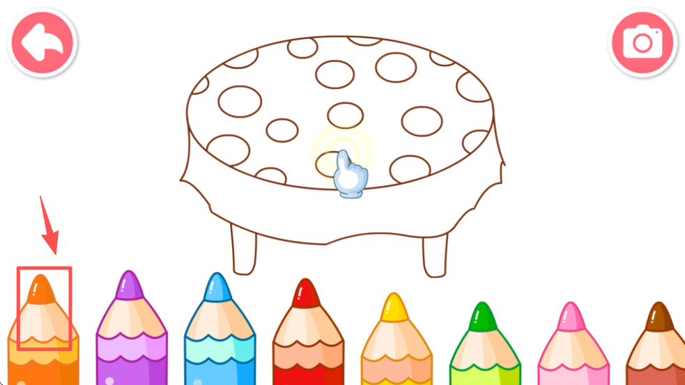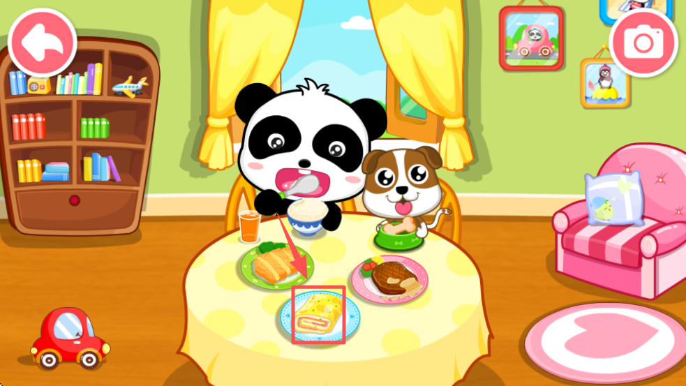 3、涂色游戏,在房间场景中,点击食物或物品,使用画笔进行涂色。
