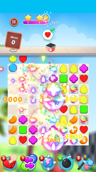 2.玩家通过点击糖果来消除相同颜色的糖果,每个关卡设有不同的目标和难度,玩家需要用有限的步数或时间来完成消除任务;