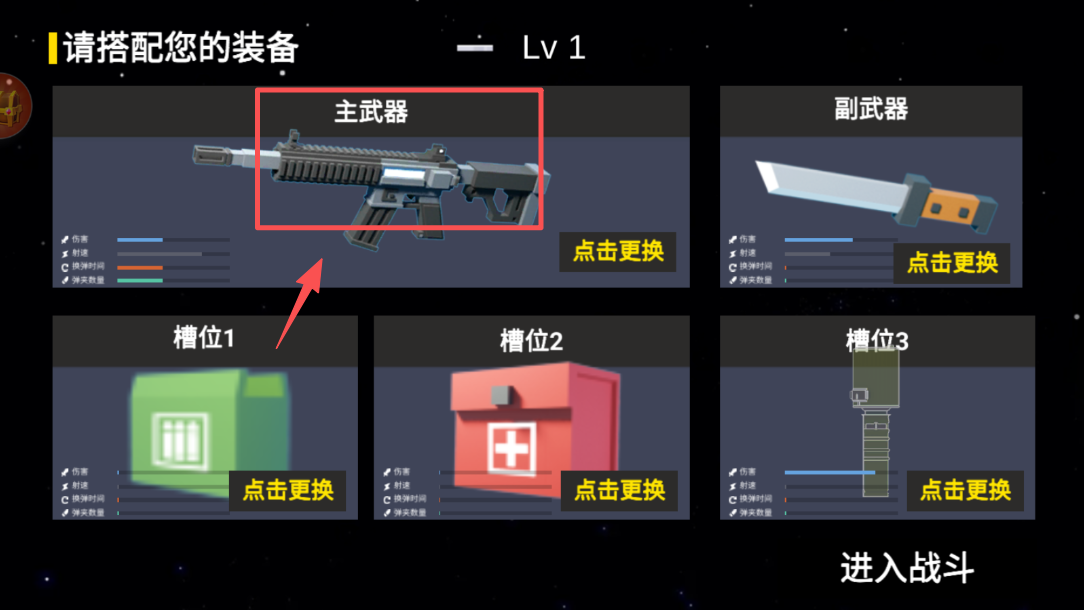 3、在装备界面,点击“主武器”和“副武器”进行武器选择和装备。