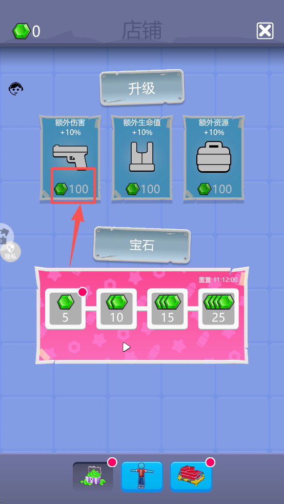 2、在商店界面,点击“额外伤害”图标并使用宝石进行升级,提高角色攻击力。