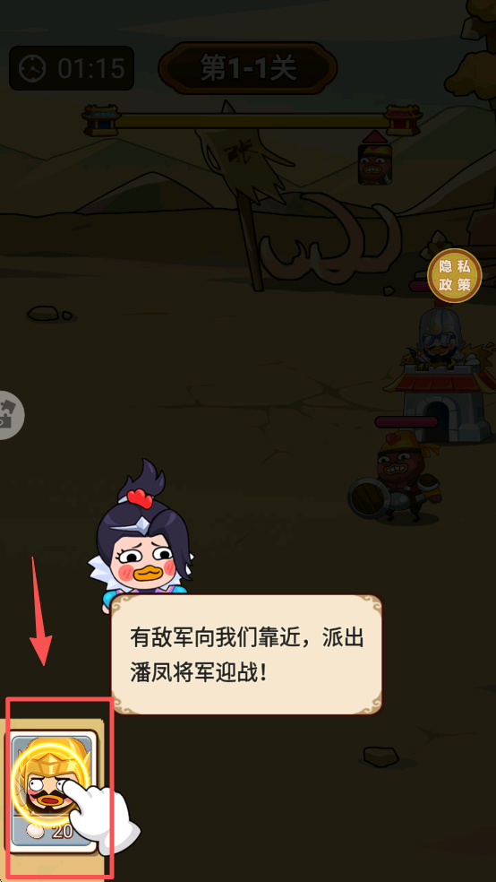 3、根据游戏提示,点击并选择武将卡牌,部署武将进行战斗。
